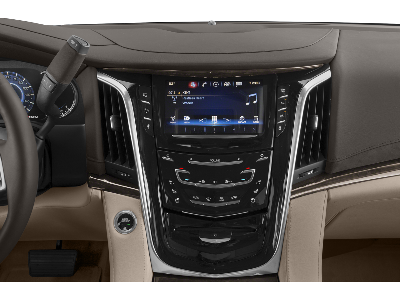 - Cadillac user experience with embedded navigation AM/FM stereo with 8" diagonal color information display featuring touch response, haptic feedback, gesture recognition, Natural Voice Recognition, Phone Integration for Apple CarPlay and Android Auto capability for compatible phone, Connected Apps and Teen Driver. Five USB ports, including one in the articulating storage door/bin and auxiliary audio port